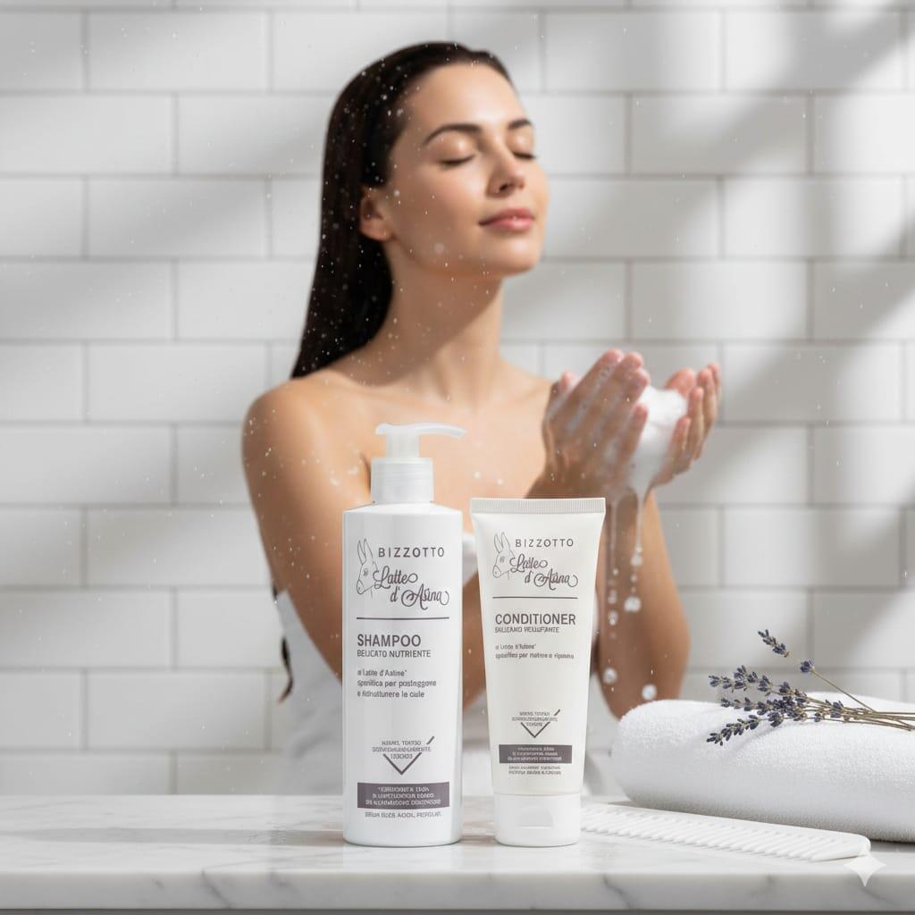Balsamo Vellutante Nutriente (200ml): Il tocco finale per una chioma disciplinata e setosa. Questo balsamo districa istantaneamente i nodi e sigilla le cuticole, eliminando l'effetto crespo. Il latte d'asina nutre la fibra capillare, lasciando i capelli leggeri, luminosi e incredibilmente morbidi al tatto.